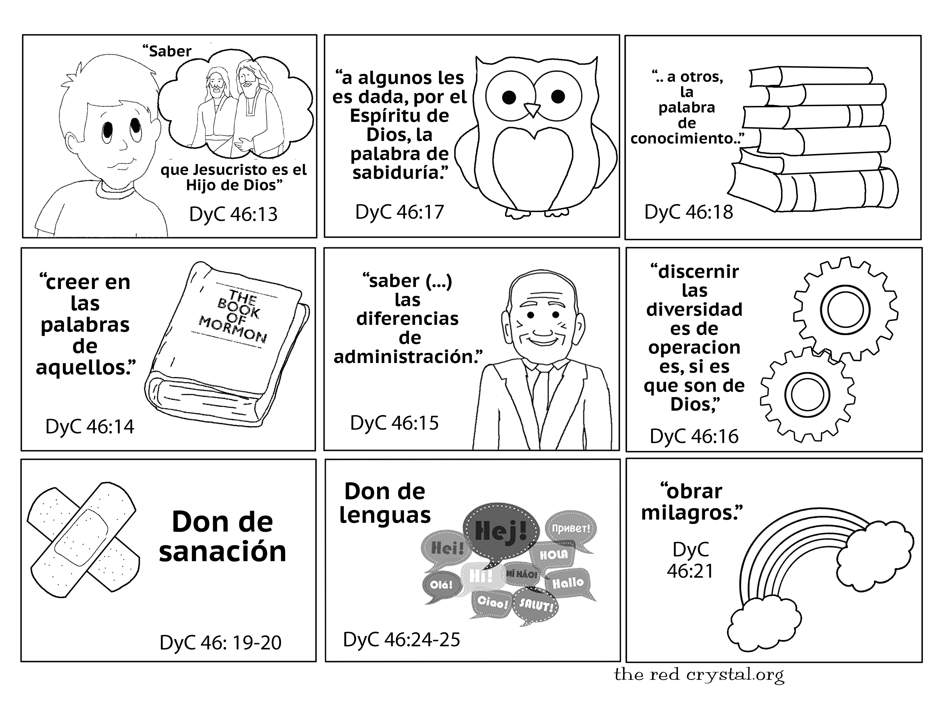 Para ayudar a los niños a aprender acerca de los dones espirituales descritos en Doctrina y Convenios 46:13–26, considera la siguiente idea. Podrías escribir los dones en hojas de papel y ocultarlas por la sala. A medida que los niños encuentren cada papel, ayúdalos a buscar en qué parte de la sección 46 se menciona ese don. Habla con ellos sobre cómo se usa cada don para bendecir a otras personas (las descripciones que se encuentran en “Capítulo 20: Dones del Espíritu Santo”, en Relatos de Doctrina y Convenios, págs. 77–80, podrían resultar útiles).